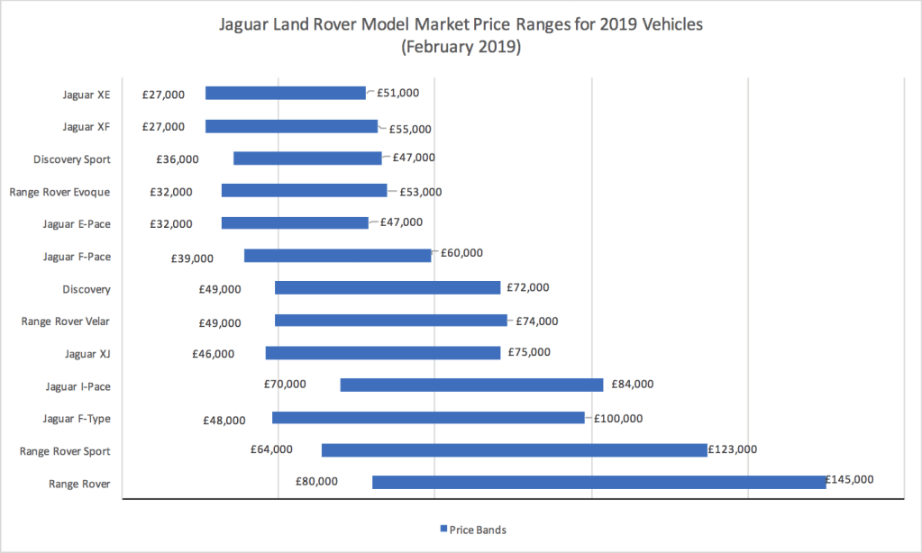 Intrigued by the article I decided to consider how much crossover there was in the marketplace. Searching on Autotrader for 2019 models (mostly physical, nearly new cars with under 1,000 miles) I looked at the highest and lowest prices of each model, ignoring published list prices, which are often discounted, leads to the below figure: